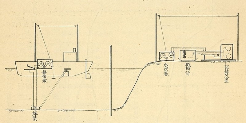 今回は海底トンネルのお話としましょう。 ここ関門海峡では、今からさかのぼること86年前、海底弾性波探査が実施されました。 日中事変直前の昭和11(1936)年に、鉄道省下関改良事務所主管で実施された関門トンネル海底部の弾性波探査は、 当時、東京大学地震研究所の研究科目の一つでもあり、専門技術者も東京帝国大学地震研究所に集まっていました。 専門技術者には、那須信治技師,萩原尊礼技手,俵俊一郎技手などいずれも地震学では著名な研究者が名を連らね、 彼らを臨時に嘱託として採用し調査を実施しました。今に思えば、大変豪華なメンバーです。