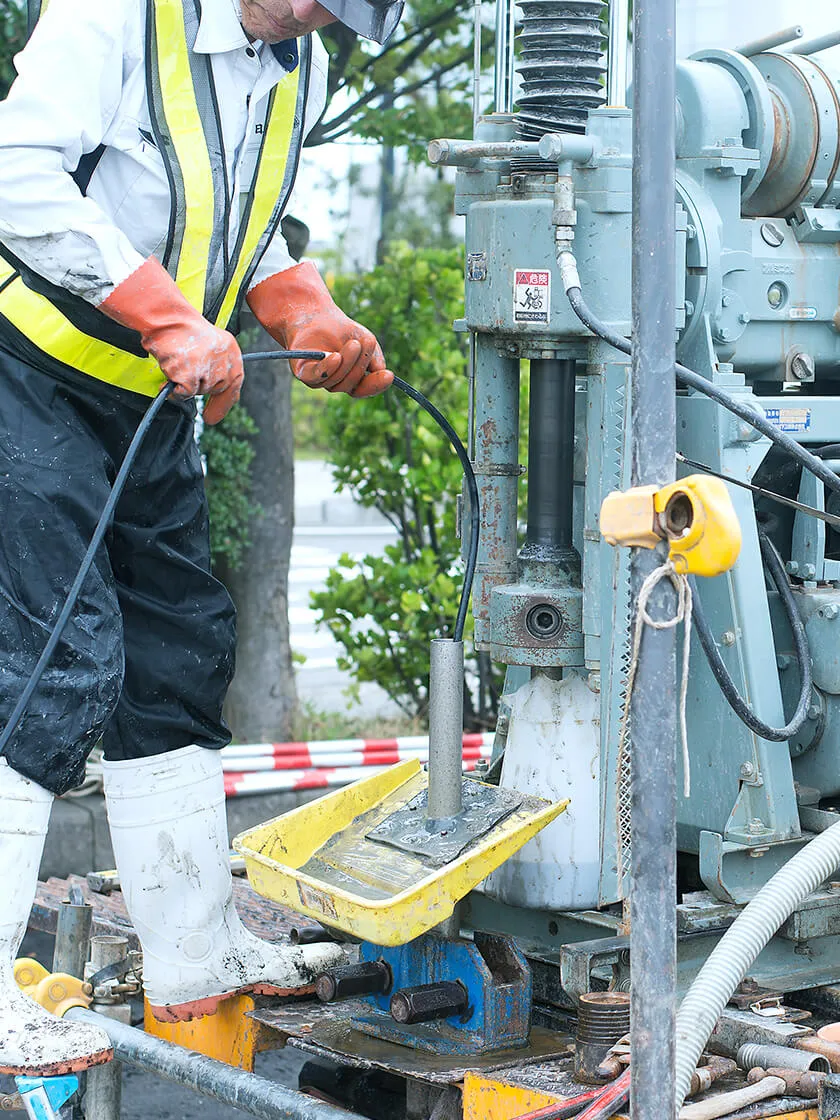 長年の経験を活かし、自社で開発・製造した専用機器やシステムにより、正確な地盤調査を実現しています。