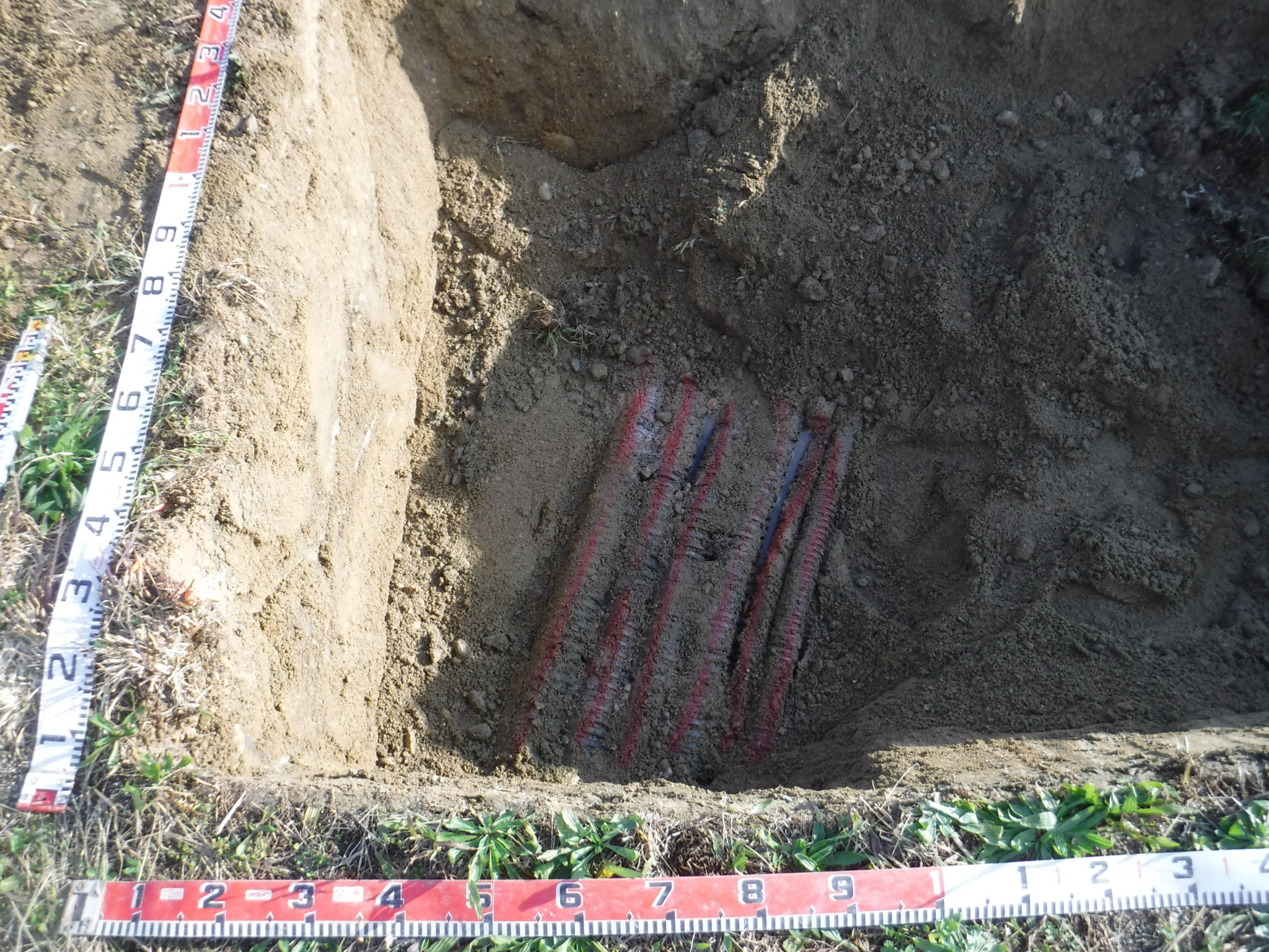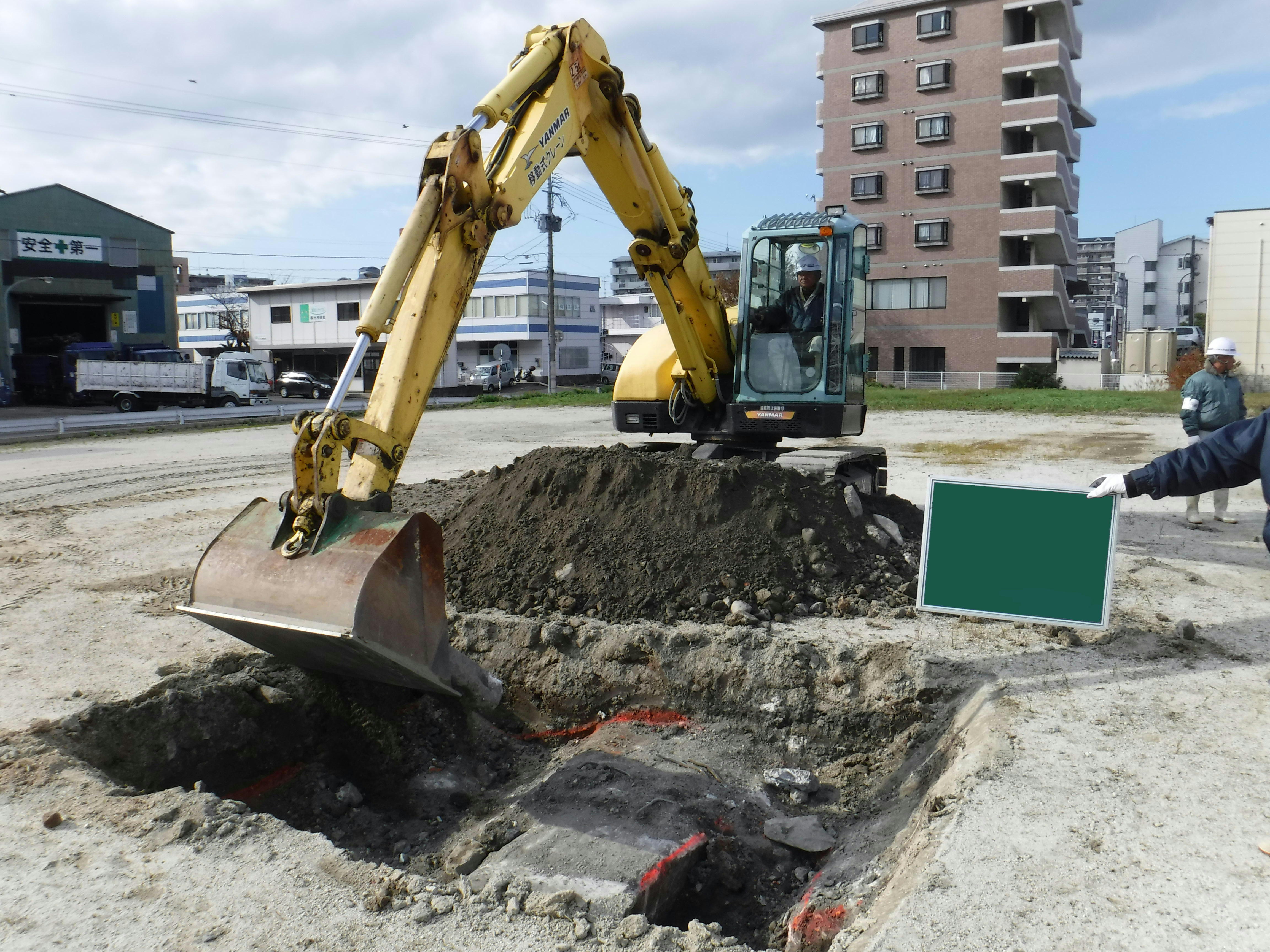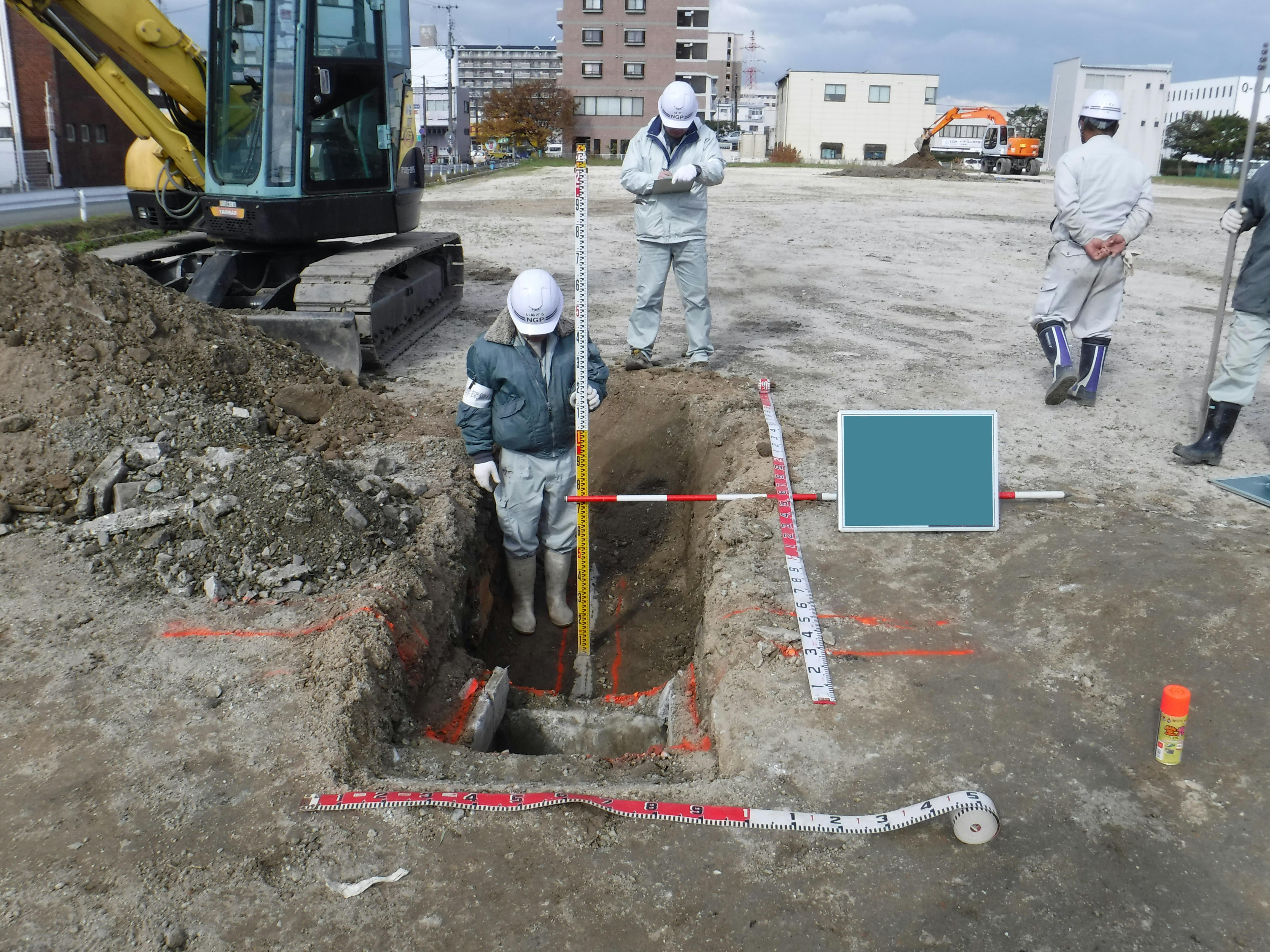 土地の再利用の障害となる埋設物(残置物、廃棄物)の有無を把握するために、地中レーダ探査を実施しました。地中レーダで反応があった地点を試掘し、実際の埋設物を確認しました。また、反応のあった範囲をもとに埋設物の量を推定しました(発注:国土交通省 大阪航空局)。